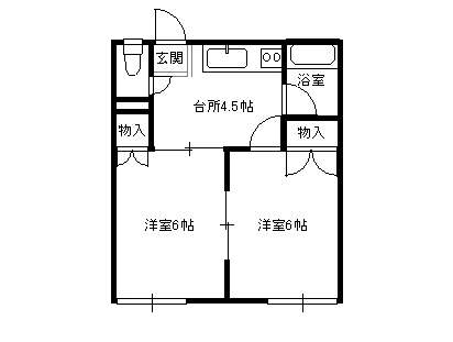 | 詳細間取 | 2K (洋6帖×1、洋6帖×1、キッチン4.5帖) | ||