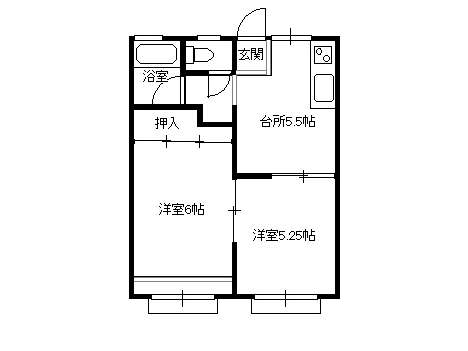 | 詳細間取 | 2K (洋5.25帖×1、洋6帖×1、キッチン5.5帖) | ||